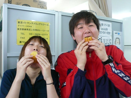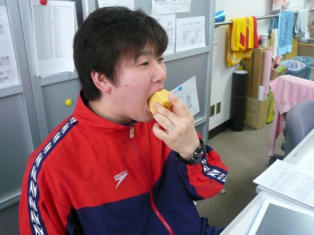 コーチ室で、差し入れに頂いたバームクーヘンを美味しそうに食べていました☆
