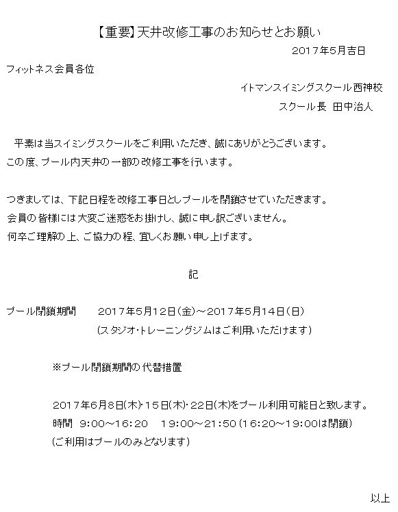 ※重要※【フィットネス】 5月12日(金)〜14日(日)の営業について