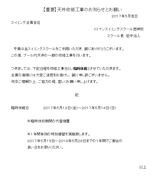 ※重要※ 【スイミング】5月12日(金)〜14日(日)の営業について