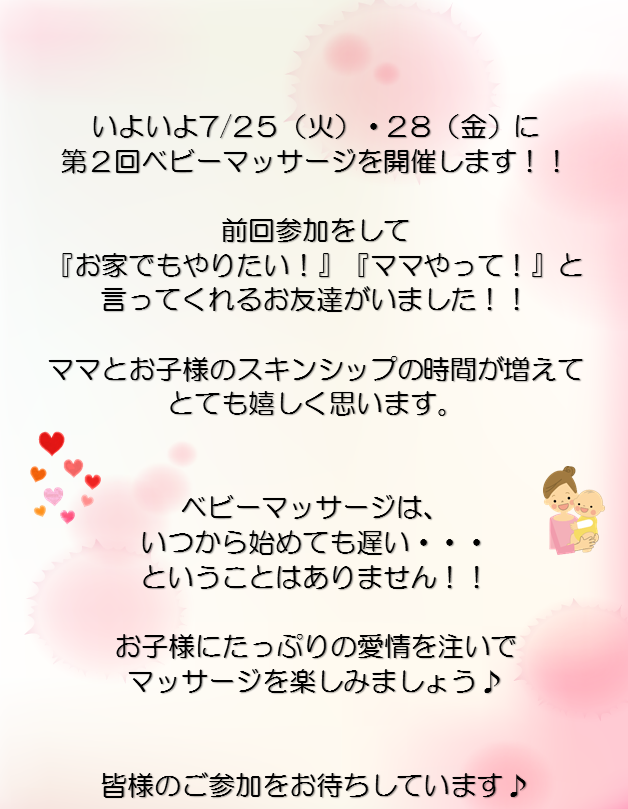 第2回ベビーマッサージ 来週開催です!