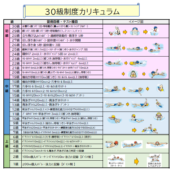 ・初級A (1)基礎能力の習得(呼吸法、蹴伸び、クロールキック等)