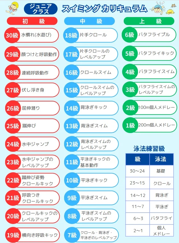 イトマンスイミングでは、経験豊富なスタッフが、まったく初めての方からマスターズ大会に出場する方まで、それぞれのレベルに合わせて、きめの細かなカリキュラムで、楽しく丁寧にご指導いたします。
