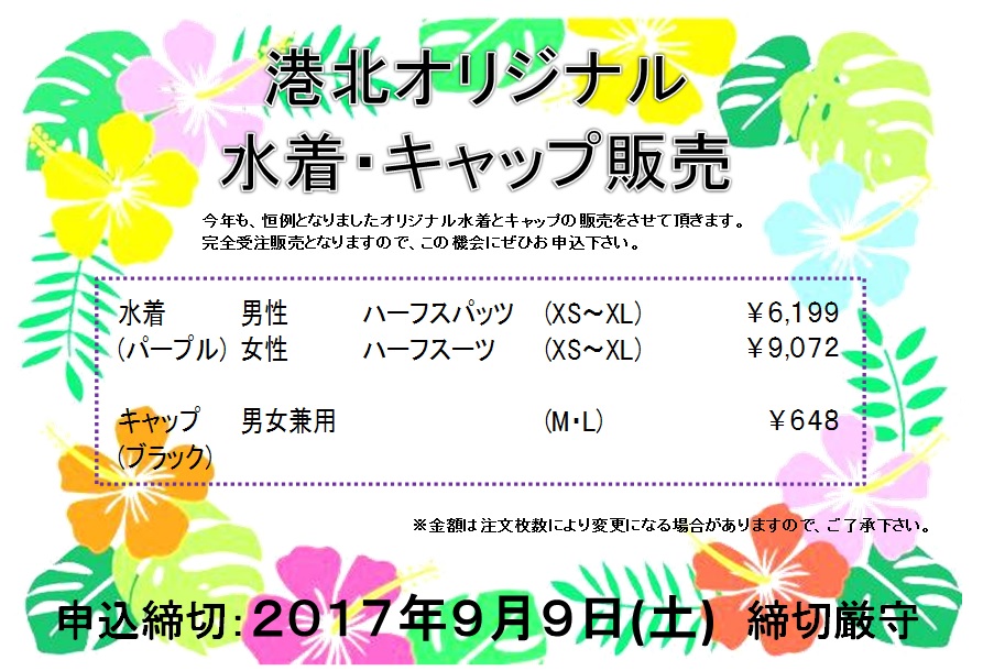 港北オリジナル水着・キャップ販売のお知らせ