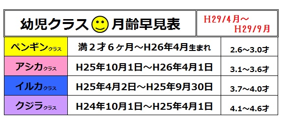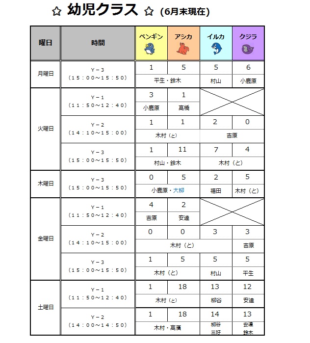 H29年7月幼児クラス在籍人数と担当コーチです!振替やクラス変更の際にご活用ください★★