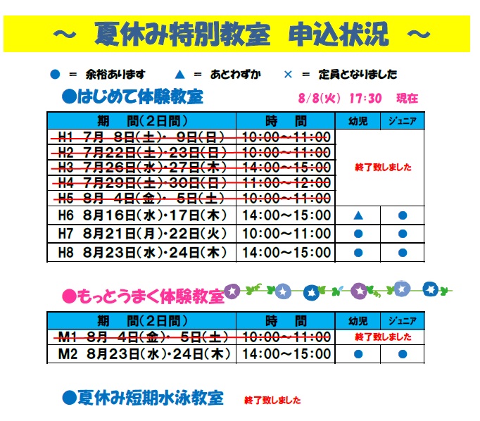 8/8(火)現在 夏休み特別教室申込状況です♪