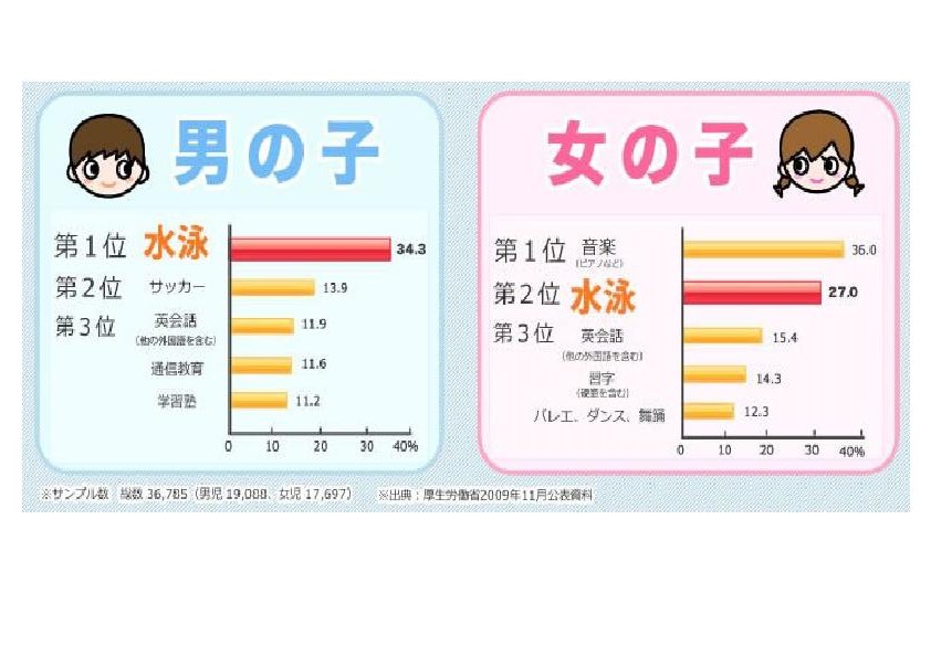 「水泳」を習っているお子さんは男児で34.3%、女児で27.0%と全体に占める割合が非常に高いことがわかります。男の子ではサッカーを抜いて堂々の1位、女の子でもバレエなどの憧れの習いごとよりも人気が高いことが分かります。 今子ども達に人気の習い事は<スイミング>なのです。