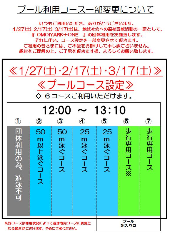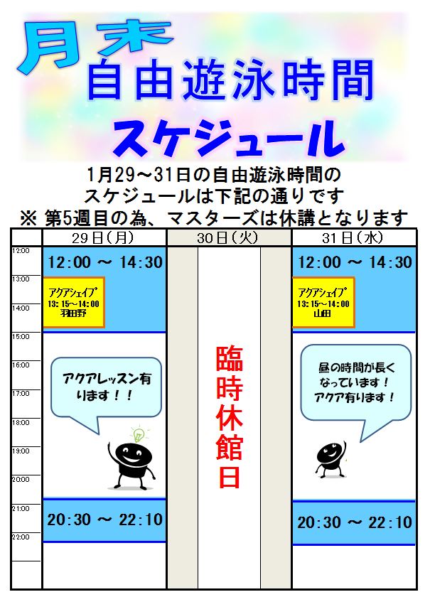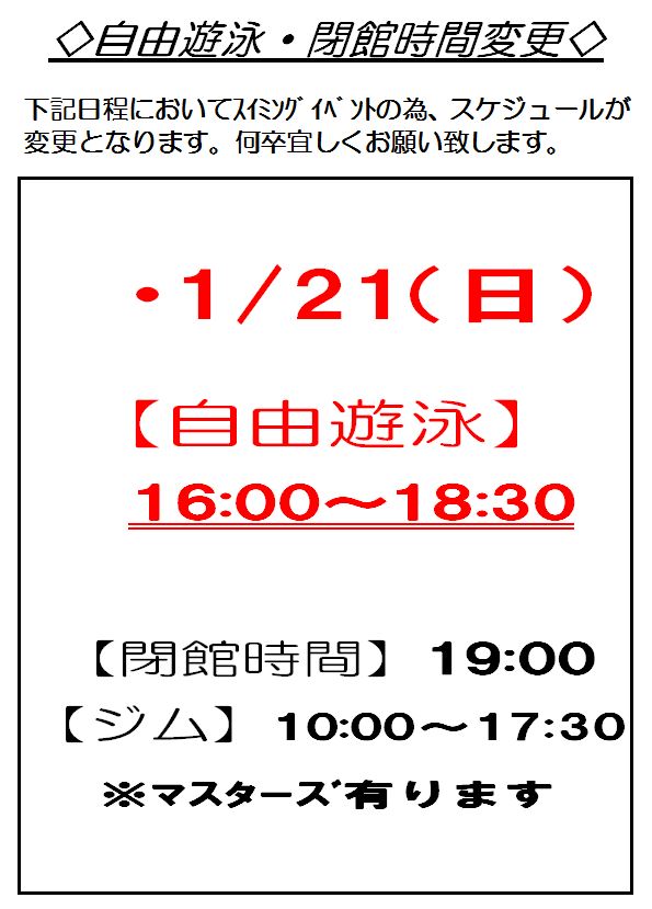 下記の日時、自由遊泳時間が変更になります。