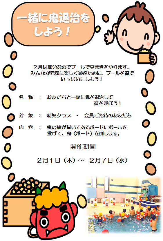プールで元気に楽しく遊べるように鬼を退治してプールに福をいっぱい呼び込もう!