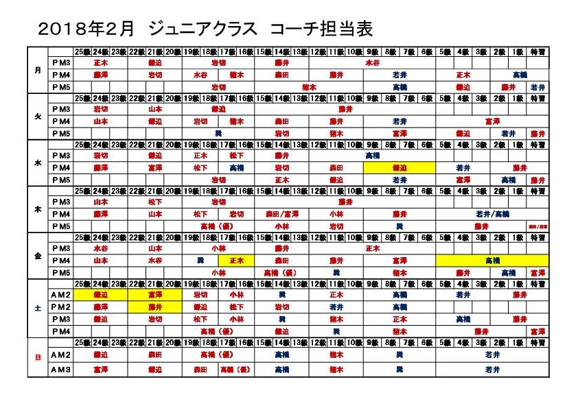 ジュニアクラス2月コーチ担当表