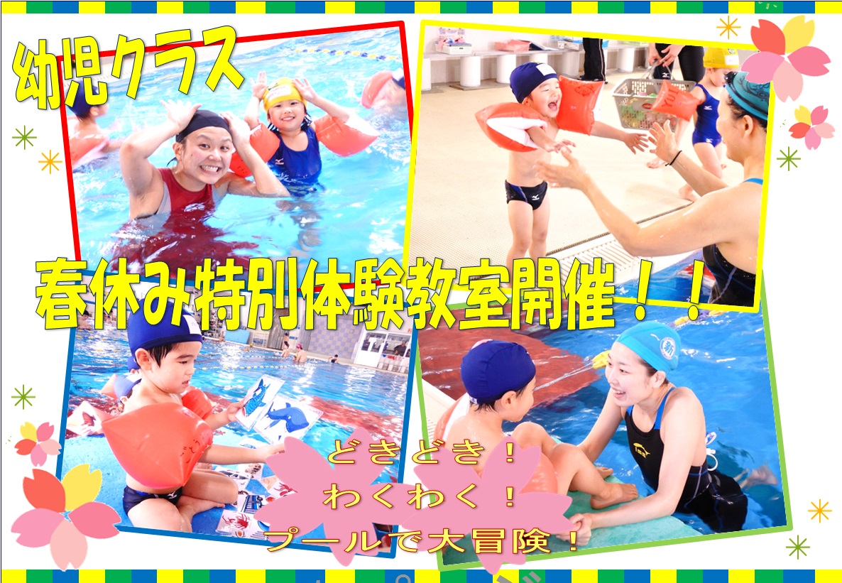 「スイミングを習わせたい」「夏までに水慣れさせたい」とお考えの保護者の皆さま。この春、幼児クラス(2歳6ヶ月〜4歳児)では体験教室を開催します。