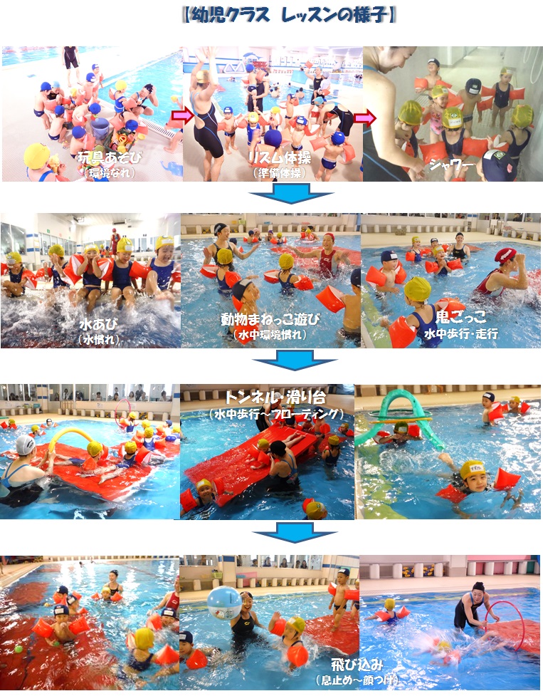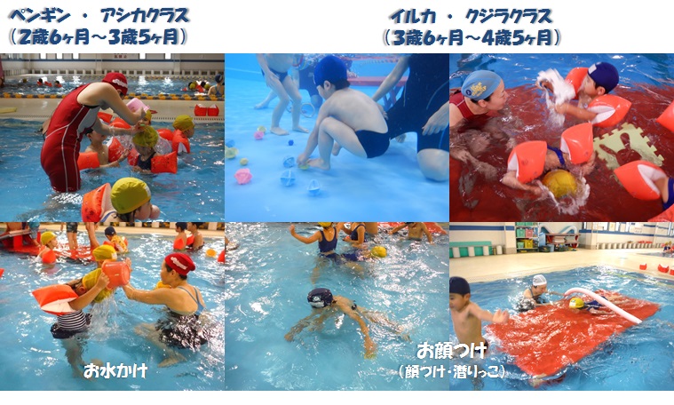 幼児クラスは、2歳6ヶ月〜4歳児の小さなお子様の水なれを進める水泳レッスンクラスで、小さなお子様が楽しみながら自然に水なれが進むよう、様々な水遊びを組み合わせて “ 水なれ〜泳ぐ ” までを習得していくようカリキュラムが組まれています。