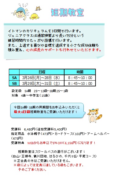 短期集中で水なれ・レベルアップをしたいとお考えの方は、ぜひイトマン新百合ヶ丘校へお越しください!