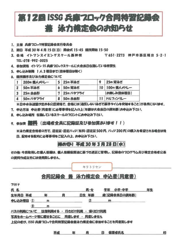 第12回 ISSG 兵庫ブロック合同特習記録会 兼 泳力検定会