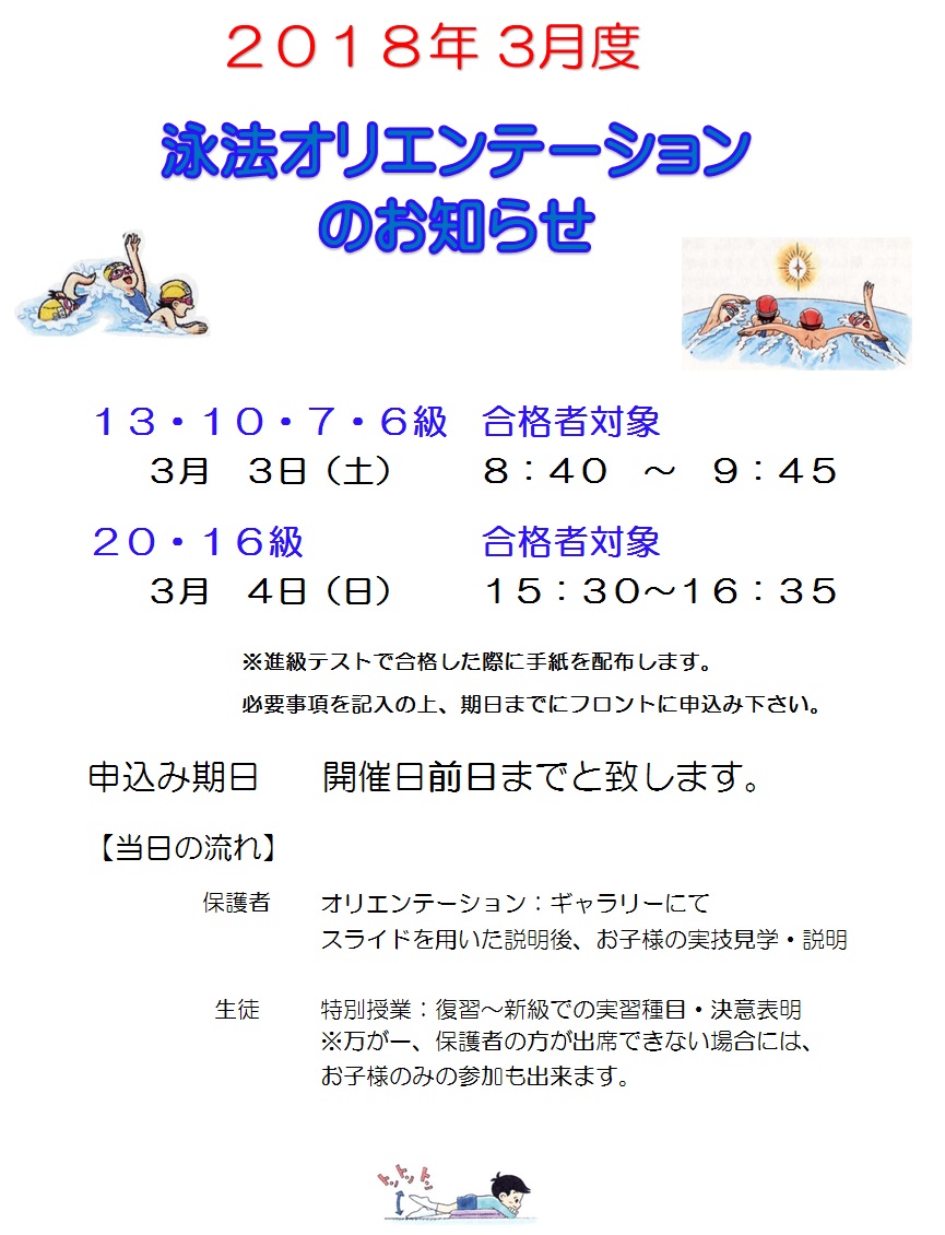【ジュニアクラス】3月度泳法別オリエンテーションのお知らせ