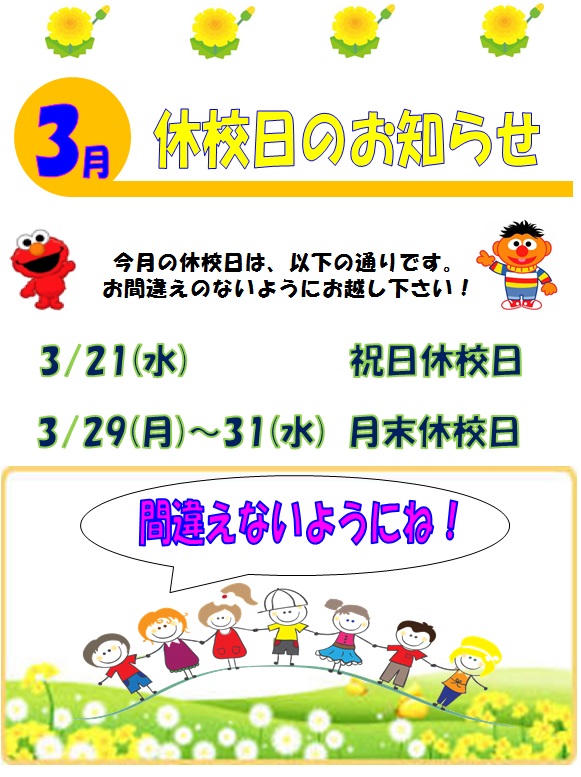 3月☆休校日のお知らせ