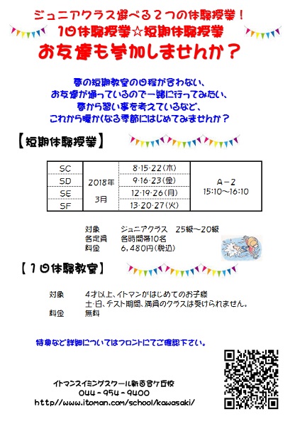 【ジュニアクラス】春季短期体験授業・1日体験教室のお知らせ