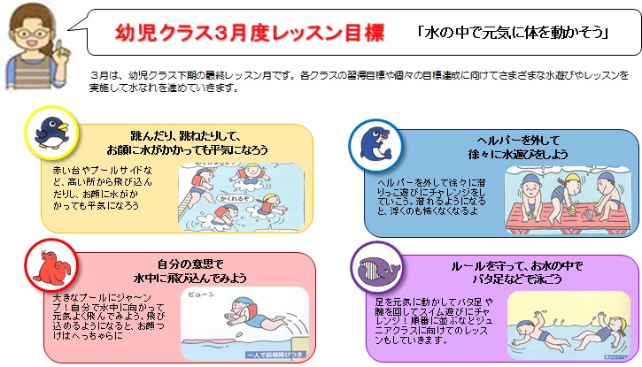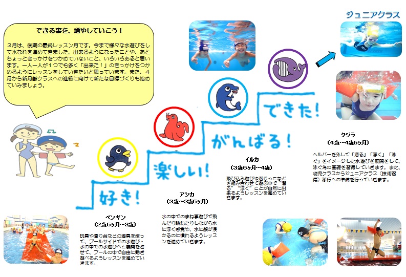3月は、幼児クラス下半期のレッスンの最終月です。各月齢での習得目標の種目遊びをたくさん行っていきますので、お休みをしないでがんばっていきましょう。 そして、4月から新月齢クラスに進級をするお子様、ジュニアクラスの水泳技術習得レッスンに進まれるお子様と様々です。次のステップに向けて新たな目標も作っていただくため、今後の流れを少しご紹介してみましょう。