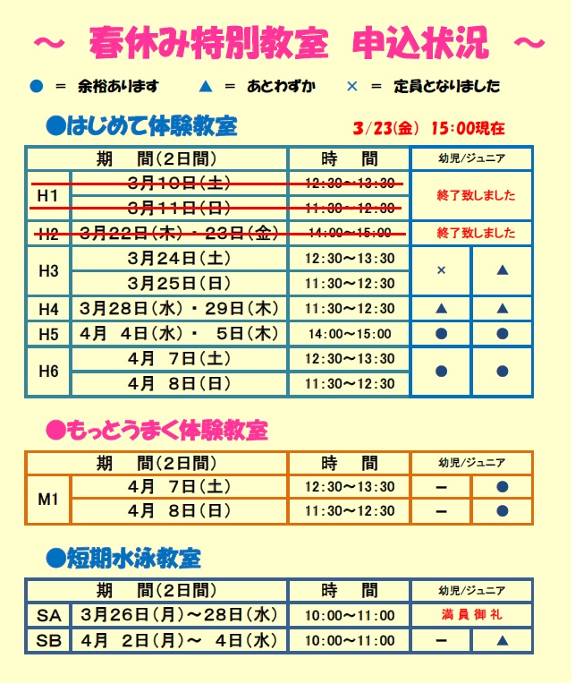 3/23(金)現在 春休み特別教室 申込状況です