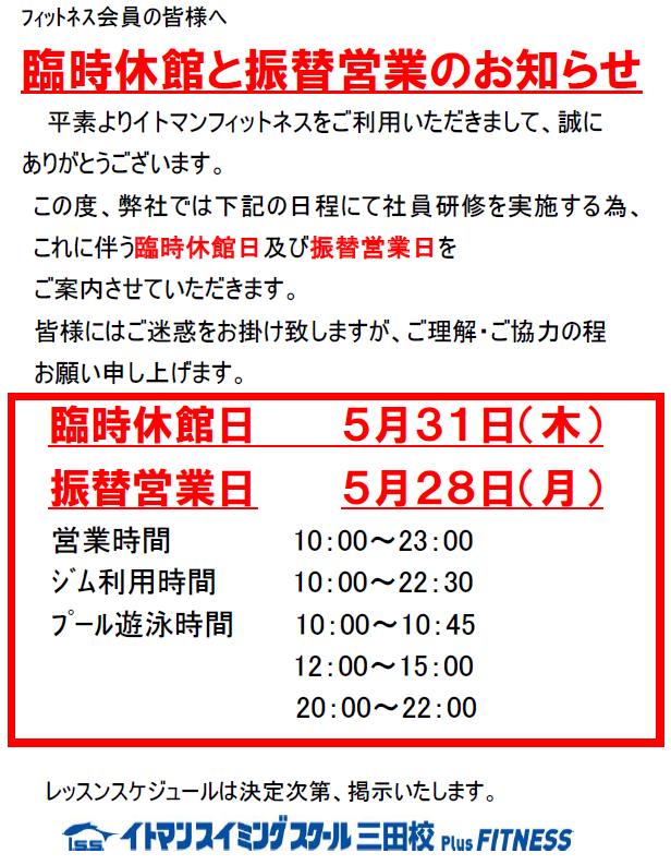 臨時休館と振替営業のお知らせ