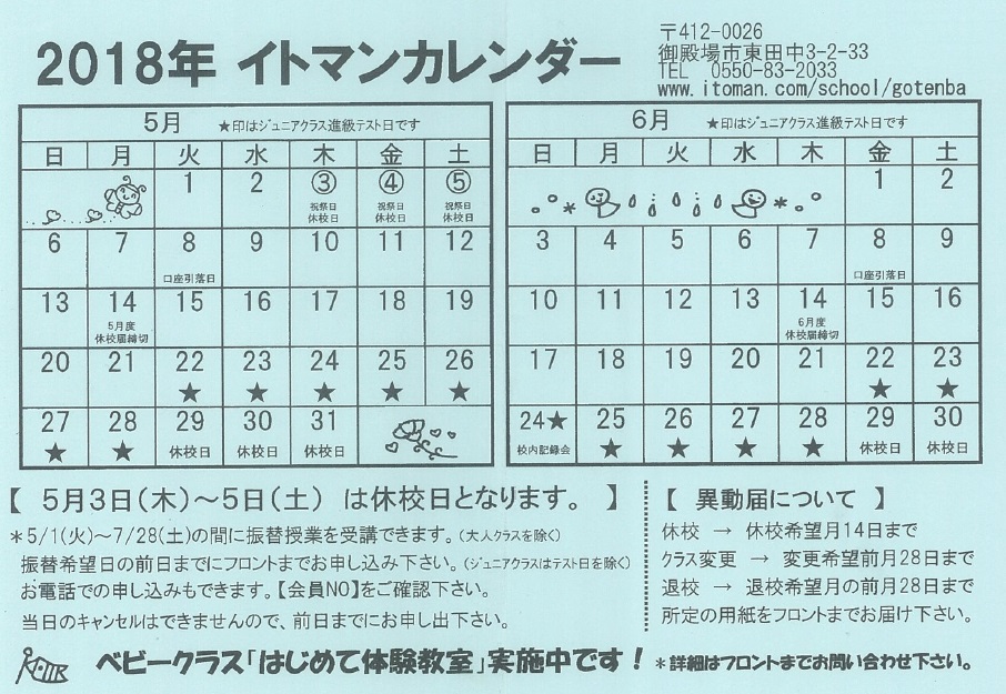 月末休校日となります。(振替対象外となります) *各お手続きは 5月28日(月) 18:30までとなります。 お早めにフロントまでお越し下さい。 6月は 1日(金) 10:30より通常営業となります。