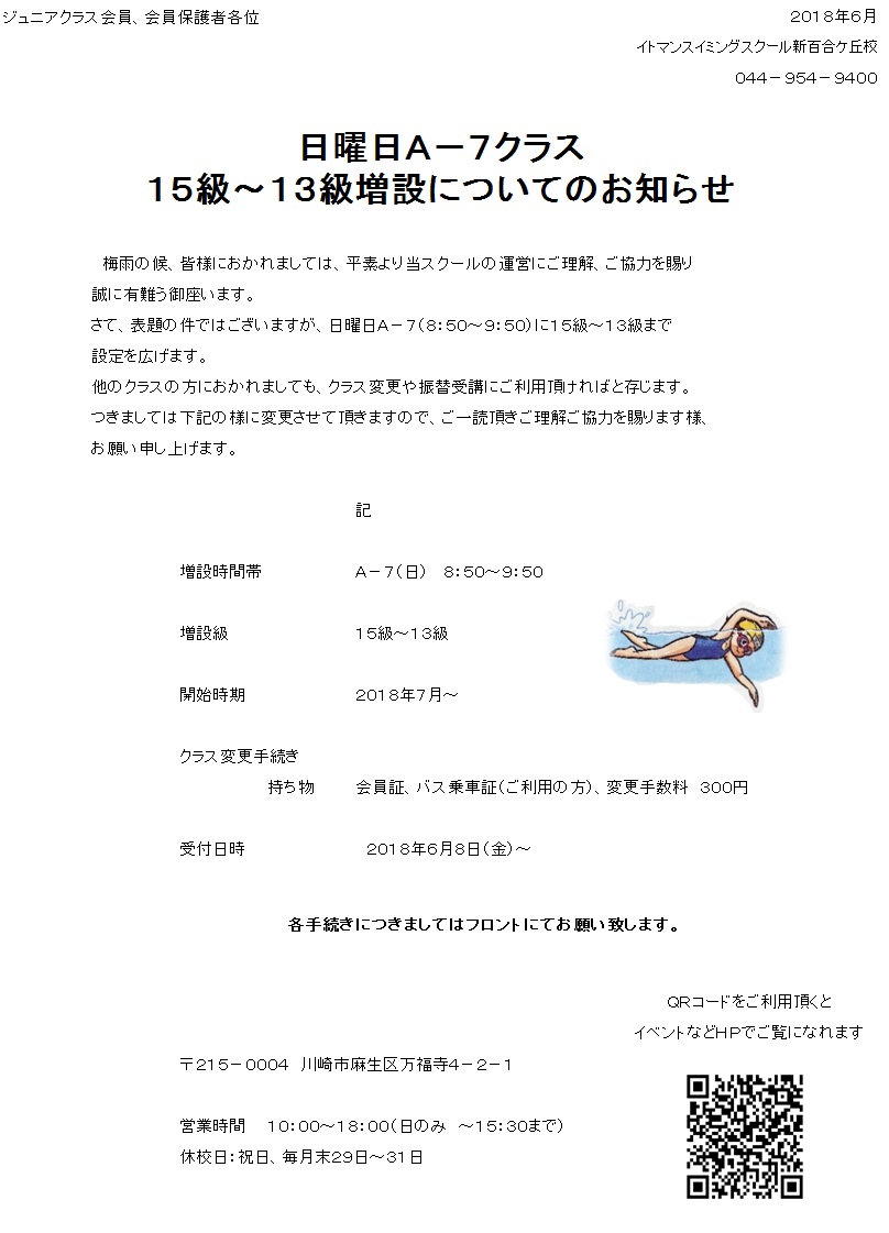 ジュニアクラス【日曜日A−7クラス15級〜13級増設について】
