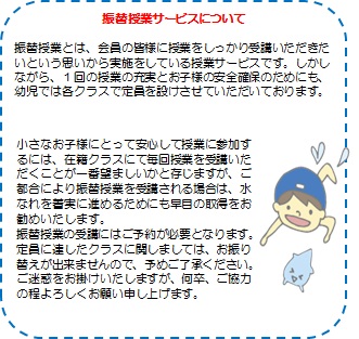 毎週しっかり体調管理をおこなって、レッスンに参加をして、水遊びを充分におこなっていくことが水なれへとつながっていきます。もし、突然の体調不良等でお休みをしなければいけなくなった場合は、振替授業サービスをご利用いただき、レッスンにしっかり参加をして、水なれを進めていきましょう。
