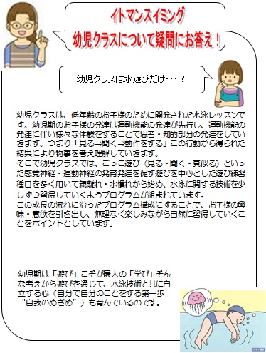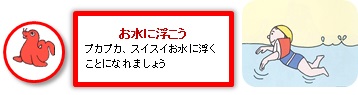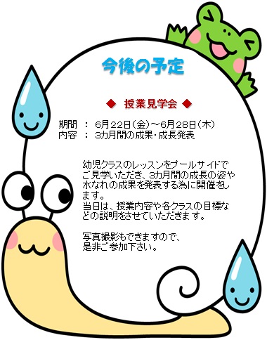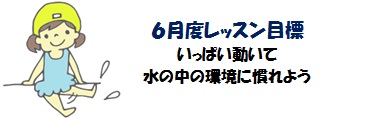 6月度のレッスン目標は、お水の中の環境になれると題して “浮く、顔つけ、潜る” この3点の水泳基礎技術を身につけることを目的とした水遊びを各クラスでおこなっていきます。