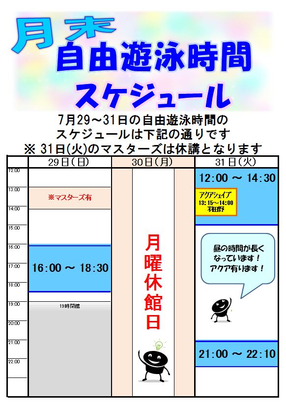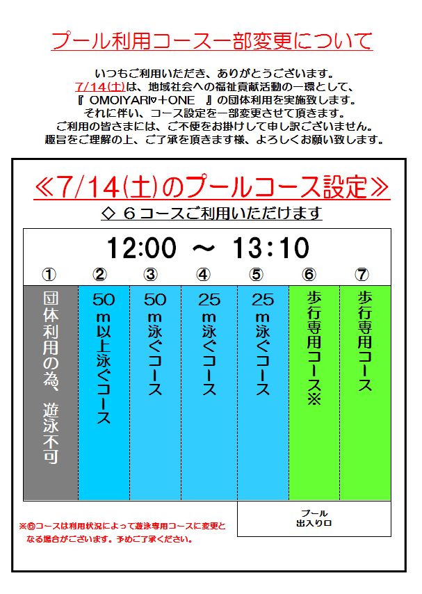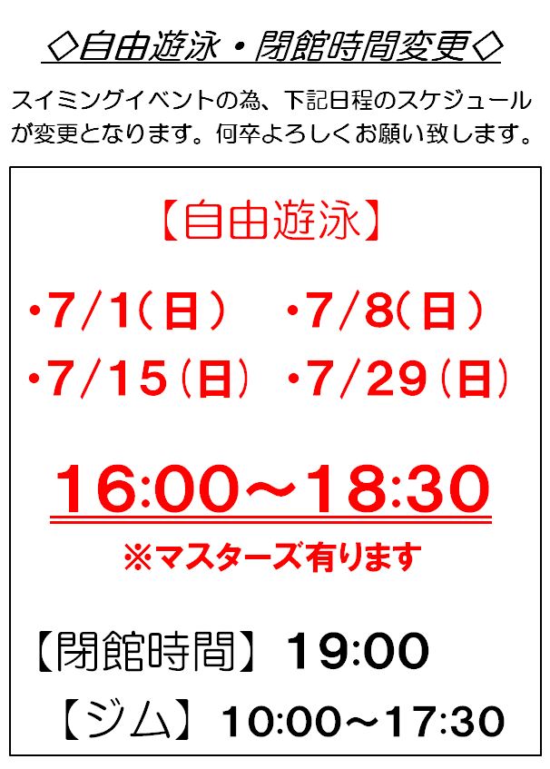 下記の日時、プール自由遊泳時間・コースが変更となります。