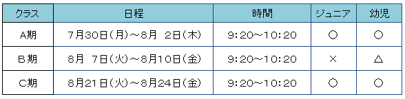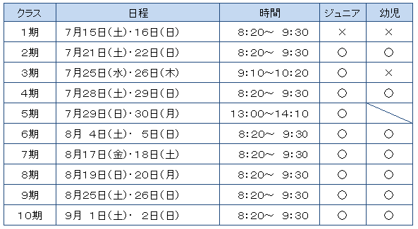 ◆ 7/4(水)10:00現在 ◆〇→空いています △→残りわずかです ×→定員です★はじめての体験教室の詳細は、こちらをクリックしてください★