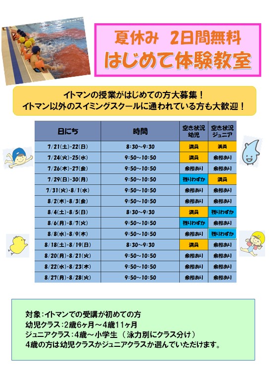 ☆はじめて体験教室空き状況☆