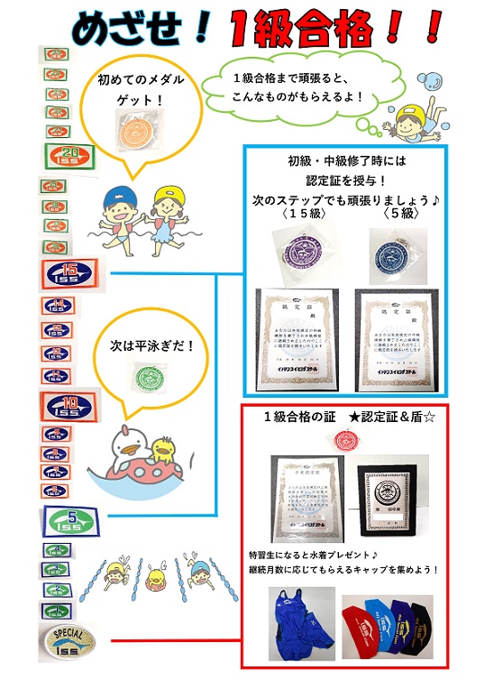 各泳法の節目にもらえるメダルや認定証をゲットしましょう!