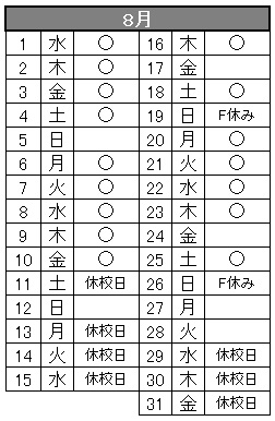 ※ F休み・・・ファミリークラスが休みの日です。