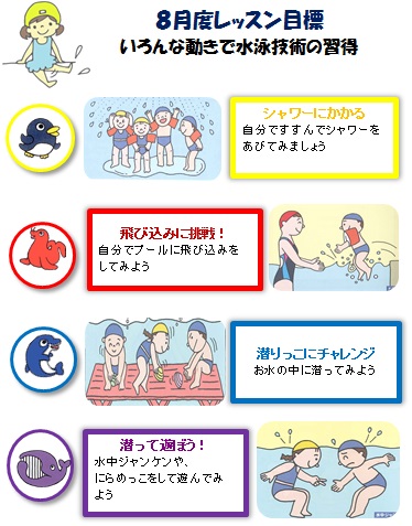 各クラスのレッスン目標の習得に向けて頑張る子ども達の姿です。日々のレッスンの中で、着実に水なれもすすみ、成長いちじるしい姿をご覧ください。