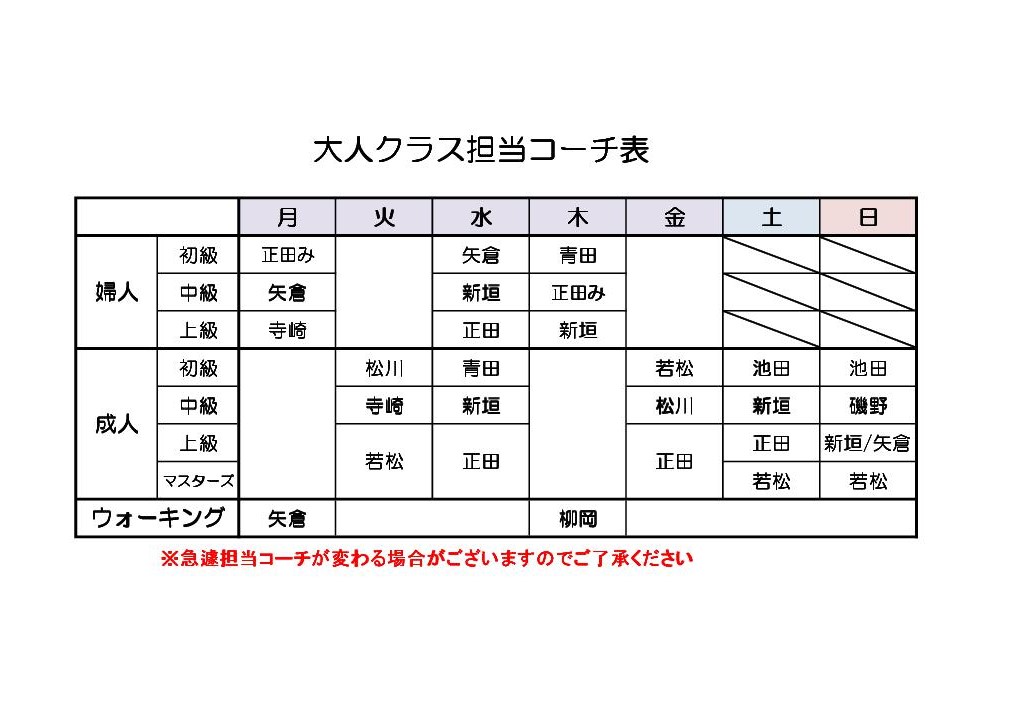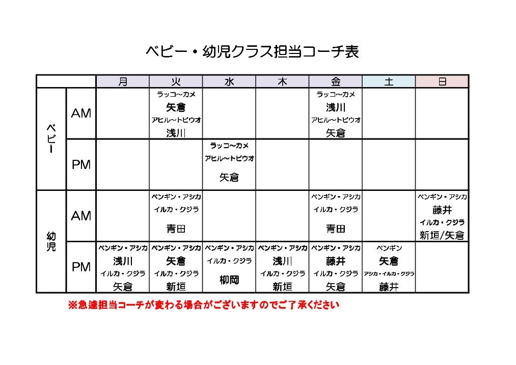 9月度担当コーチ表です。知りたいクラスをクリックしてください♪