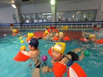 幼児クラスでは『遊び』を中心に授業を進めています!!水遊びを楽しみながら泳ぐための基本的な技術を自然に身につけることができます