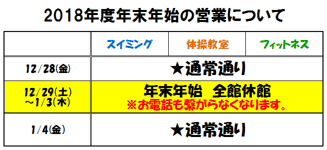 イトマンスポーツクラブ西神校では、12月28日(金)が年内最終営業日、