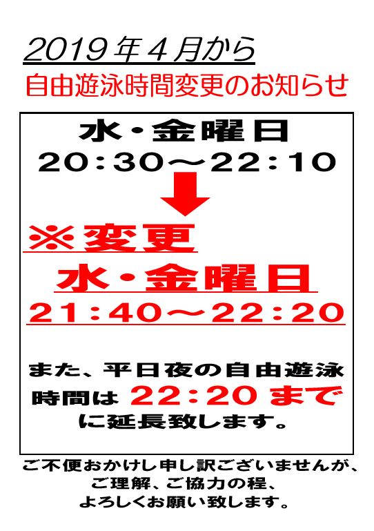 2019年4月より、水曜日、金曜日の夜の自由遊泳時間を変更させて頂きます。
