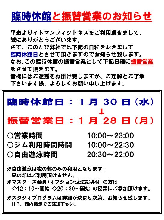 平素よりイトマンフィットネスをご利用いただきまして、誠にありがとうございます。