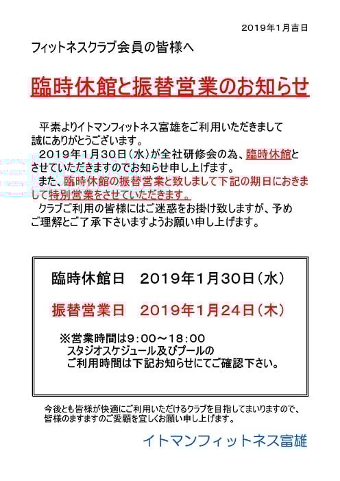 フィットネスクラブ会員の皆様へ