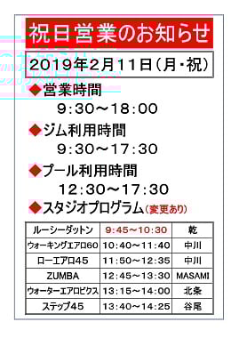 2月11日(月・祝)は祝日のためスイミングスクールはお休みです。