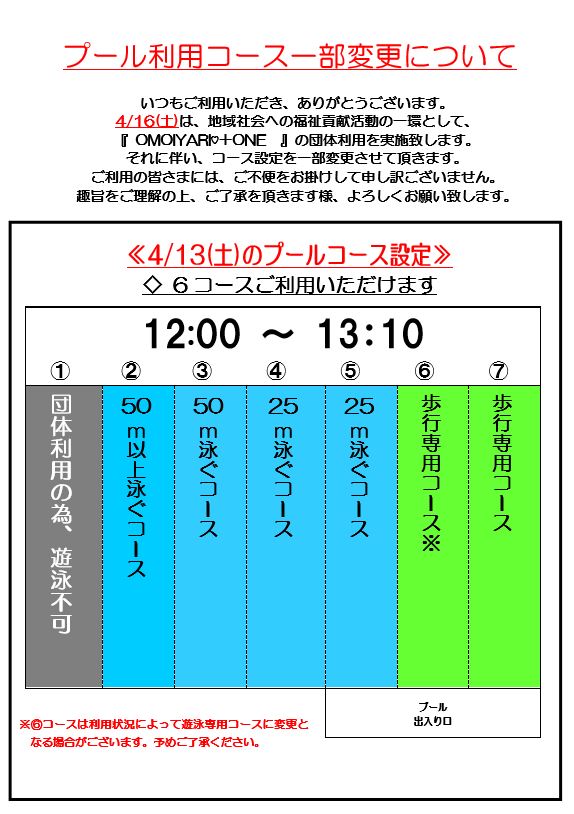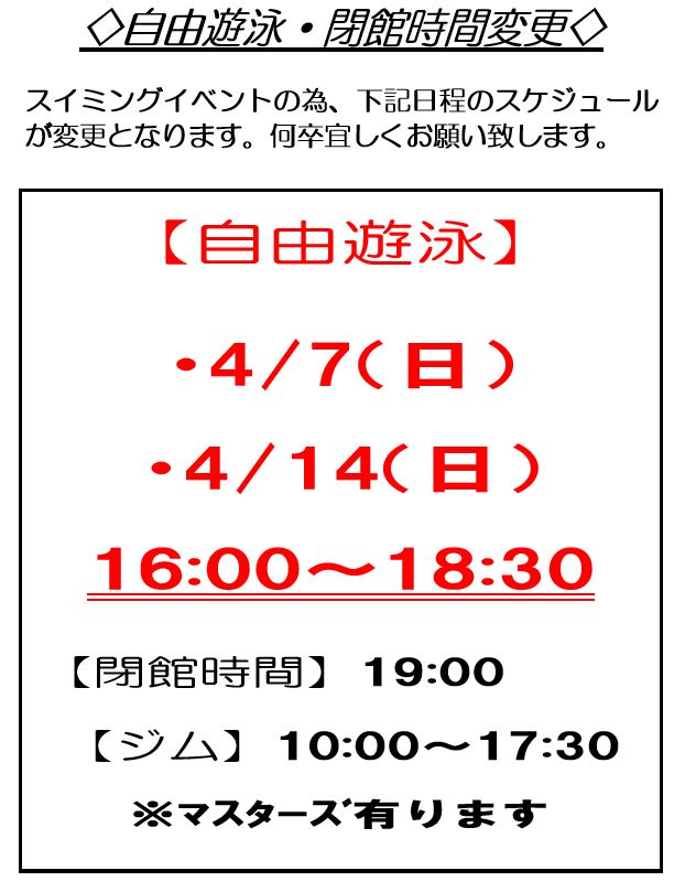 下記の日時、プール自由遊泳時間・コースが変更となります。