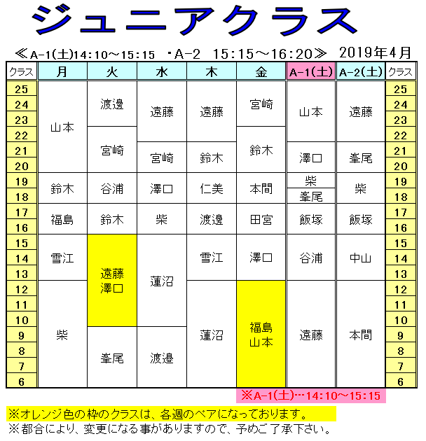 | クラス名 | 時 間 | 日 | 月 | 火 | 水 | 木 | 金 | 土 |