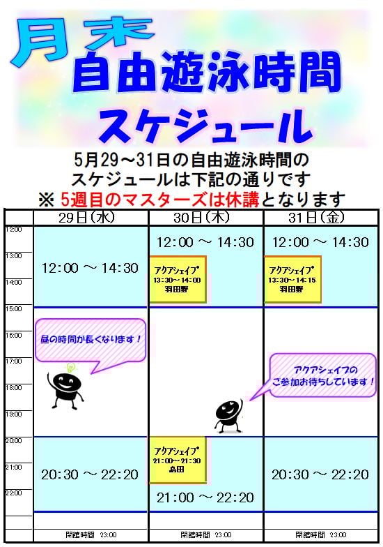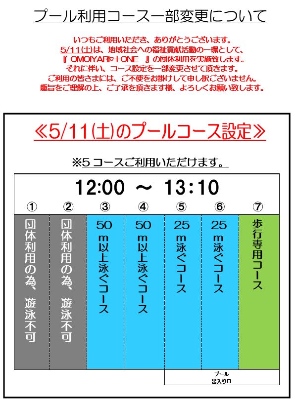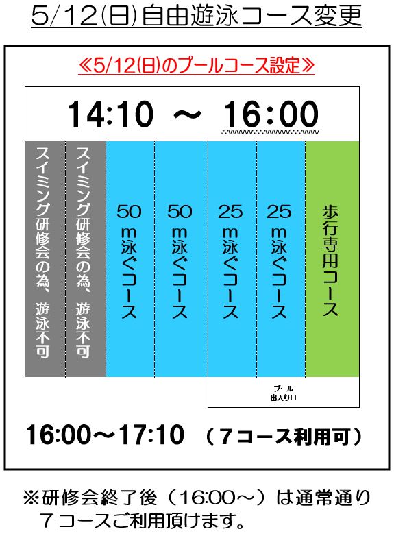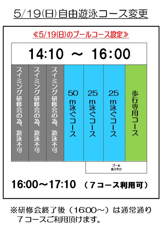 下記の日時、プール自由遊泳時間・コースが変更となります。