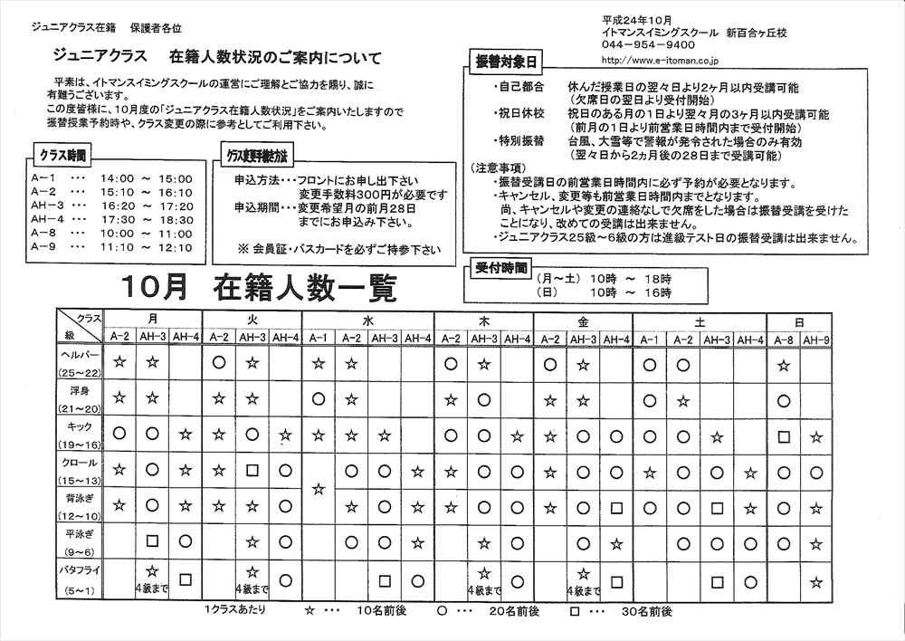 10月度ジュニアクラス人数表