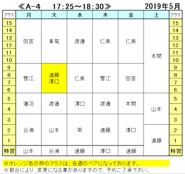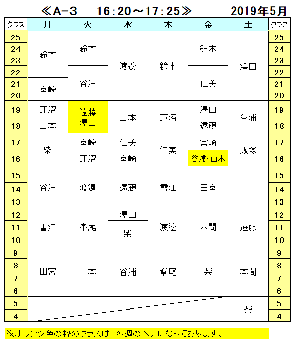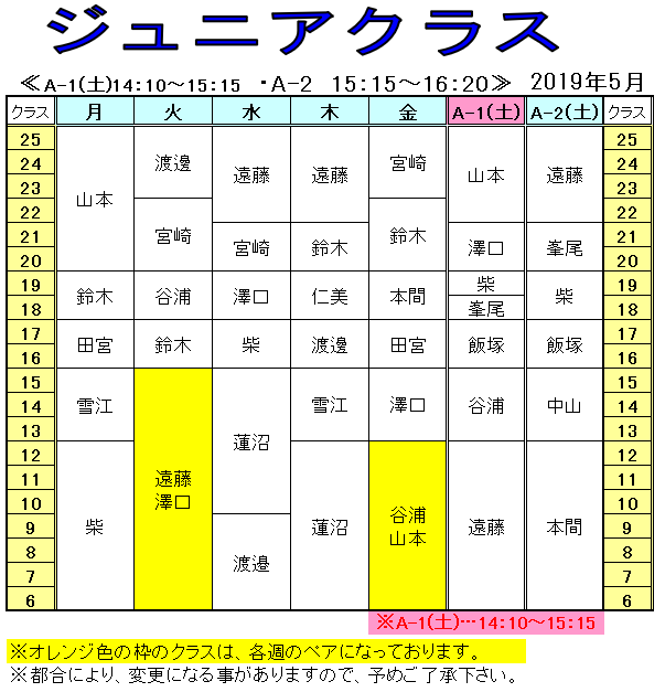 | クラス名 | 時 間 | 日 | 月 | 火 | 水 | 木 | 金 | 土 |