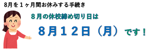 【8月休校届けの締切日について】休校届けは、毎月14日ですが8月は14日が休校日になるため、前営業日の8月12日(月)が8月休校締切日となります。