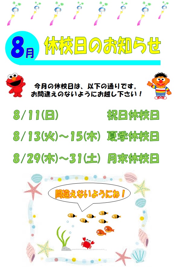 8月☆休校日のお知らせ☆