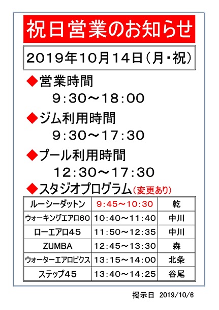 【フィットネス】10月14日(月祝)・22日(火祝)について