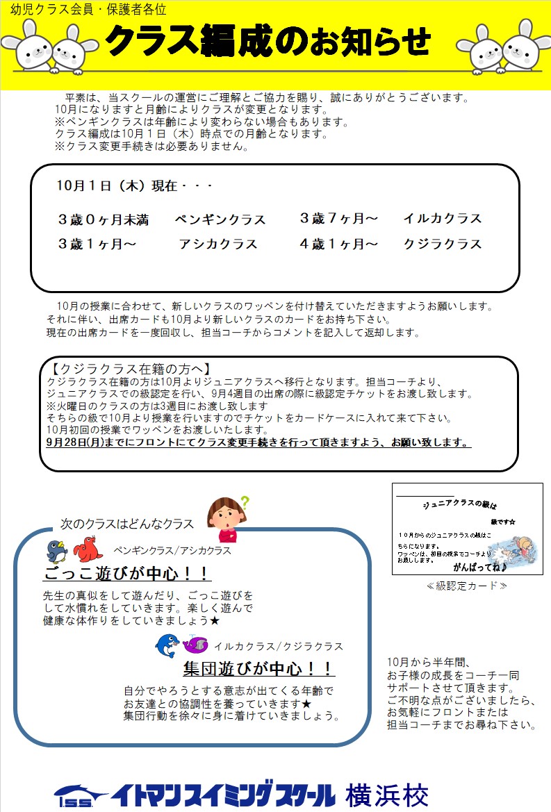 現在のクジラクラスさんは、幼児クラスからジュニアクラスへのクラス変更手続きが必要になります。