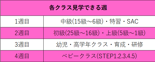 2、密集防止のため、週ごとに見学できる級が決まっております。見学時間は20分間、ご見学する保護者様も1名までとさせていただきます。